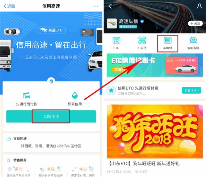 3、选择“立即使用”→“车牌付”,就可以将车牌和支付宝账号绑定了,不过需要注意的是,只有芝麻分550及以上才有机会享用哦