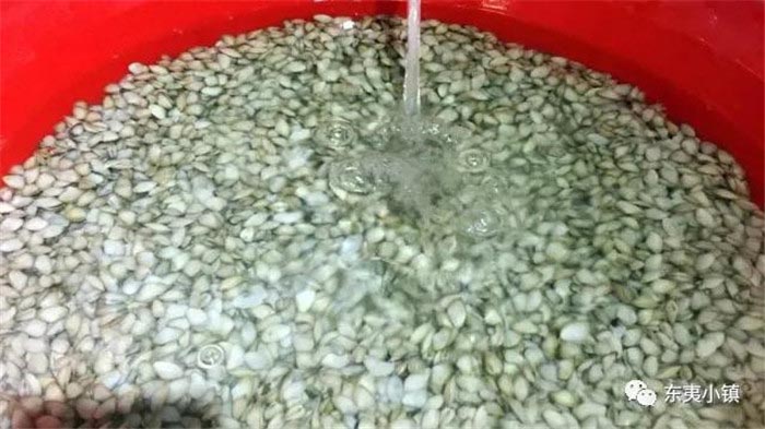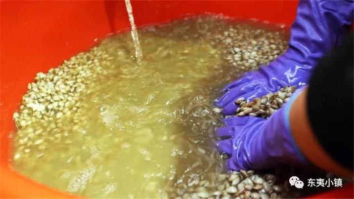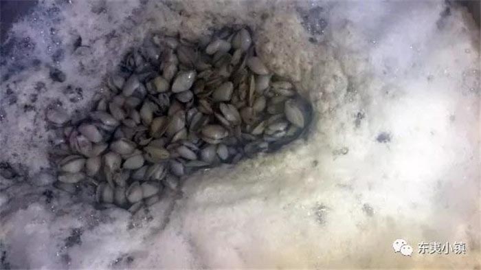❥ 煮“海沙子”是一门技术活,当淘洗干净的海沙子下锅,随着温度的上升,海沙子就会张开了口子。煮好的海沙子连部分汤水放入洁净的不锈钢盆,用勺子轻捻、搅打,贝肉慢慢会浮在液面上。