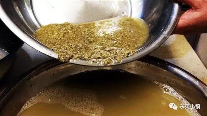 ❥ 继续研捻,再取一个盆,像淘米一样来回淘澄汤汁,把海沙子的外壳淘出将贝肉再用原汤漂洗、除杂,沉淀汤汁。经过这些过程,海沙子就煮好了。