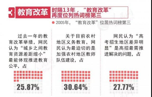 连续两年,反腐、社会保障、医疗改革居热词榜前三。今年,我国教育改革一直向纵深推进,各省市高考改革陆续落地,“教育改革”话题时隔13年,再度挤进前三。
