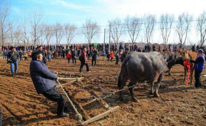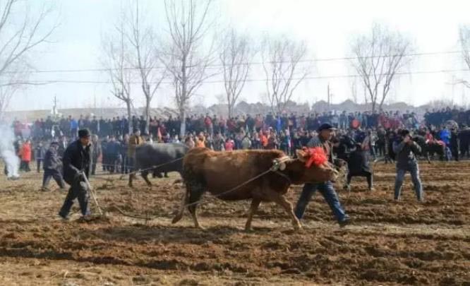 最重要的还是“闹春牛”活动。活动形式多种多样。上双疃村的“闹春牛”活动主要是组织各家各户的牛进行耕地比赛。