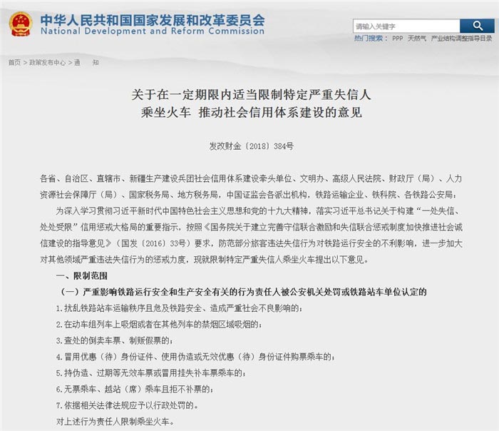 近日,国家发展改革委、中央文明办、最高人民法院、财政部、人力资源社会保障部、税务总局、证监会、铁路总公司发布《关于在一定期限内适当限制特定严重失信人乘坐火车推动社会信用体系建设的意见》,自2018年5月1日起实施。