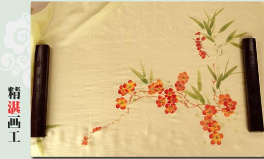 丝巾采用天然桑蚕丝、天然植物染料,刮浆丝网印染而成。品格高雅,可佩戴装饰,也可装裱镜框,具有很强的使用性和装饰性。